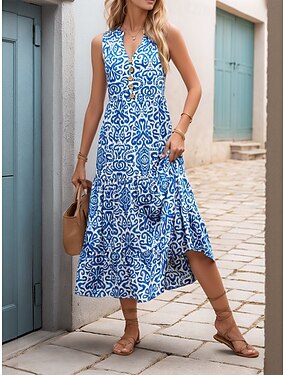 Kvinnors Midi Klänning Boho Avslappnad Klänning Svingklänning Sommarklänning Klänning Vintage Strand Vanlig Passform Blommig Grafisk Ärmlös Rundhalsad Blå Röd Grön Sommar Vår