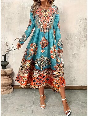 Dam Långklänning Maxiklänning Boho-klänning Elegant Vintage Mode Dagligen Utomhus Strand Normal Grafisk Blomma Långärmad Rund hals Blå Svart Gul Rodnande Rosa Vår Höst