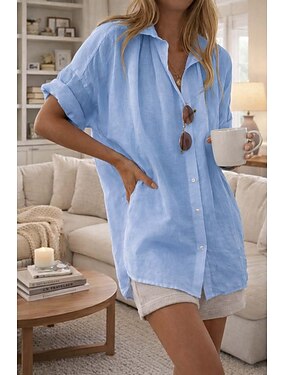 Dam Skjorta Bomulds Blanding Boho skjorta Knapp Upp Slät Ledigt Strandstil Kortärmad Tröjkrage Vanliga toppar Svart Vit Gul Rodnande Rosa Himmelsblå Sommar