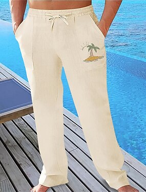 Herr Linne Byxor Långbyxor Sommarbyxor Strandbyxor Ficka Snörning Elastisk midja Grafisk Komfort Andningsfunktion Semester Dagligen Helgdag Hawaiisk Boho gurkmeja Vit