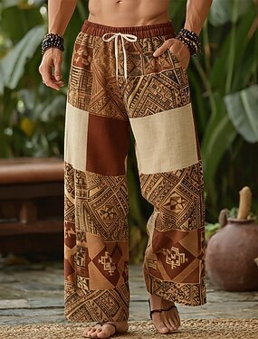 Herr Färgblock Geometriska mönster Etnisk Långbyxor Säckiga byxor Casual byxor Medium Midja Boho Vintage retro Hem Utomhus Semester Elastisk dragsko i midjan Linneliknande byxor med fickor Sommar Vår