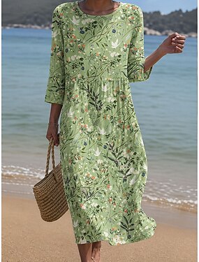 Dam Midiklänning Solklänning Sommarklänning Semester Ledigt Boho Strand Helgdag Normal Blommig Grafisk 3/4 ärm Rund hals Blå Gul Rodnande Rosa Grön Sommar Vår
