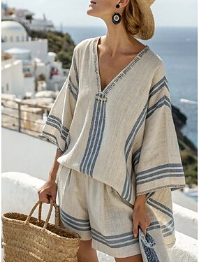 Dam Set med bomullslinne Kortärmad V-hals Ensfärgat Semester Dagligen Ledigt Dagligen Blå Svart Gul Vår & sommar