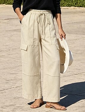 Dam Byxor av linne i bomull Militärbyxor Långbyxor Casual byxor Semester Mode Grundläggande Fullängd Medium Midja Ensfärgat Slät Snörning Ficka Elastisk midja Komfort Mjuk Andningsfunktion Oelastisk
