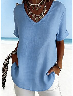 Dam Skjorta Blus Slät Stylish Klassisk Modern Kortärmad V-hals Vanliga toppar Dagligen Helgdag Utekväll Blå Vit Grå Sommar Vår