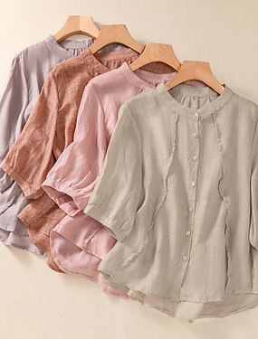 Dam Blus Konstbomullslinne Ensfärgat Elegant Ledigt Halvlång ärm Rundhals Vanliga toppar Dagligen Helgdag Blå Svart Vit Rodnande Rosa Rubinrött Sommar Höst