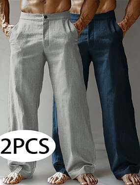 Herr Linne Byxor Långbyxor Sommarbyxor Säckiga byxor Strandbyxor Ficka Knappar Rakt ben Slät Komfort Andningsfunktion Fullängd Dagligen Strand Semester Semester Hawaiisk Grön+Grå Vit+Himmelsblå