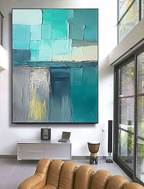 extra stor blågrå blockstruktur oljemålning på duk abstrakt minimalistisk väggkonst originell färgglad boho inredning vardagsrum heminredning