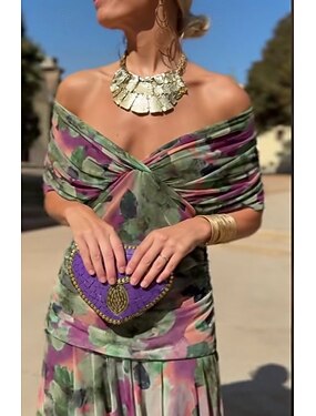 Dam Klänning Set A linjeklänning Elegant Semester Blommig Grafisk Multi lager Mönster Maxiklänning 3/4 ärm V-hals Dagligen Strand Rubinrött Purpur Orange Sommar Vår Normal