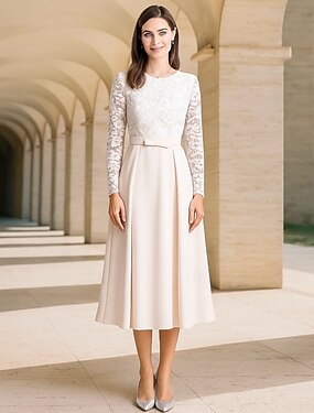 Hylsa Kolonn Knälängd Festklänning Cocktailklänning Bröllopsgästklänning Mor till bruden Klänning Korta Ärmar Långa Ärmar Crew Neck Båt Hals Elegant Vintage Fest Crepe med Bow(s)