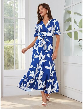 Dam Balklänning Vardagsklänning Kungsblå Kortärmad Blommig Sommar Vår V-hals Elegant Modern XS S M