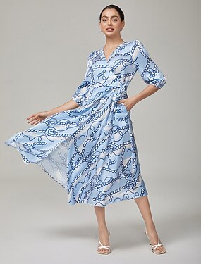Dam Vardagsklänning Midiklänning Blå 3/4 Ärm Kedjor Skriv ut Sommar Vår Vår & Höst V-hals Elegant Semester XS S M