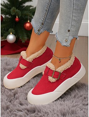 Damskor i rödimitationsmocka med bred passform, varmt plyschfoder och spännedetaljer, mysiga vinterskor för inomhusbruk &utomhuskläder