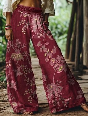 Dam Brett skaft Byxor Palazzo byxor Mode Boho Fullängd Hög midja Blomma Elastisk midja Mönster Mateial som andas Bekväm Gata Dagliga kläder Utekväll Vin Vår Höst Normal