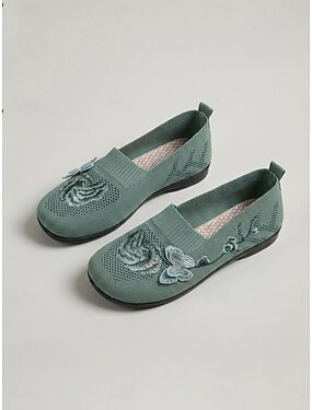 Gröna broderade stickade damskor med vid passform – andningsbara slip-on-komfortskor, lätta, avslappnade promenadskor för dagligt bruk &resa