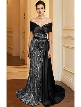 A-linje Åtsmitande Golvlång Kvälls klänningar Balklänning med överkjol Formell klädsel Elegant Färgblock Hög split Kortärmad Över axeln Bröllop Formell Satäng Paljetter med Glitter Broderad