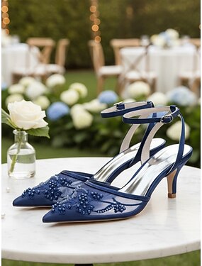 Marinblå stilettklackar med pärlor för kvinnor – eleganta skor för brudens eller brudgummens mor för trädgårdsbröllop och lyxfester