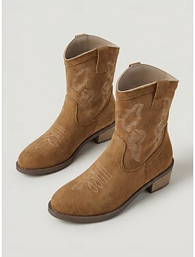 Klassiska bruna westernstövlar i mocka för kvinnor – vintage cowboystövlar med retrobroderi &blockklack för utomhusmusikfestivaler, countrykonserter &boho sommarkläder