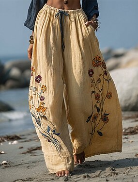 Dam Brett skaft Byxor Palazzo byxor Mode Boho Fullängd Hög midja Blomma Snörning Elastisk midja Mönster Mateial som andas Bekväm Gata Dagliga kläder Utekväll Kaki Vår Höst Normal
