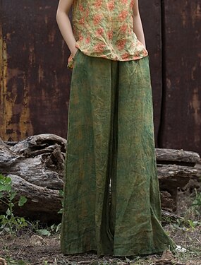 Dam Byxor av linne i bomull Brett skaft Kinesiska Sommarbyxor Semester Streetwear Fullängd Medium Midja Knytbatik Ficka Elastiskt midjeband Komfort Oelastisk Dagligen Utomhus Gata Grön Höst Vinter