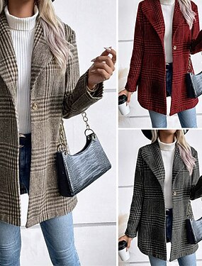 Dam Kavaj Bekväm Knappar Elegant Mode Utomhus Galler Utekväll Ledigt / vardag Helgen Enkelknäppt Normal Kavajslag Normal Långärmad Ytterkläder Rubinrött Kamel Grå Vår Höst