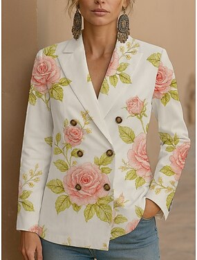 Dam Kavaj Bekväm Mönster Elegant Mode Utomhus Blomma Utekväll Ledigt / vardag Helgen Cardigan Normal Kavajslag Normal Långärmad Ytterkläder Kaki Vår Höst