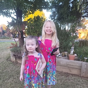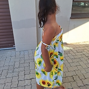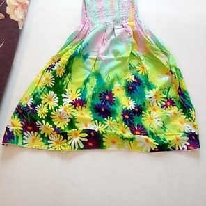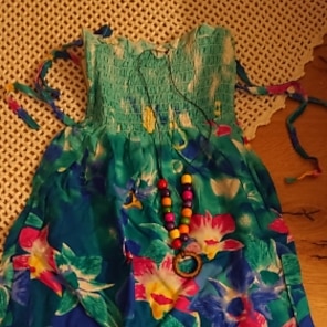 Denna klänning är närvarande. Jag tror att hon kommer att älska det. Underbar färg och tryck som på bilden. Ser snyggare ut än på mitt foto. Har en liten neckless också och storlek lite mindre än för 7-8 år, men värt priset!