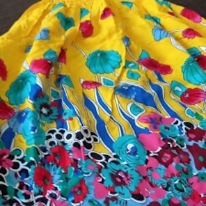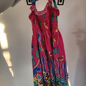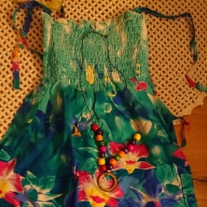 This dress is present. I beleive that she will love it. Wonderful color and print as on the photo. Looks nicer than on my photo. Has a small neckless as well and size little bit smaller than for 7-8 years, but worth the price!