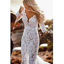 Strandbröllop strand öppen rygg boho bröllopsklänningar a-linjeformad v-hals långärmad kjol tåg spets brudklänningar med enfärgade |