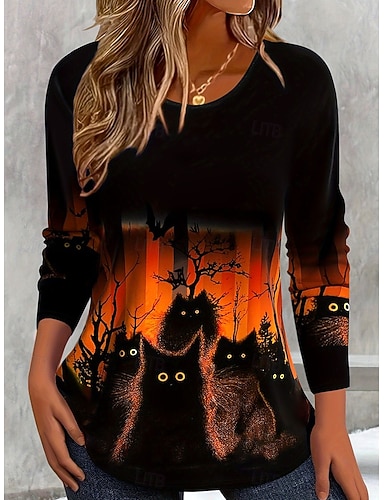 Kvinnors T-shirt Pumpa Grafisk Katt Vintage Stilren Klassisk Långärmad Crew Neck Vanliga Toppar Daglig Tryck Orange Vår Höst Vinter